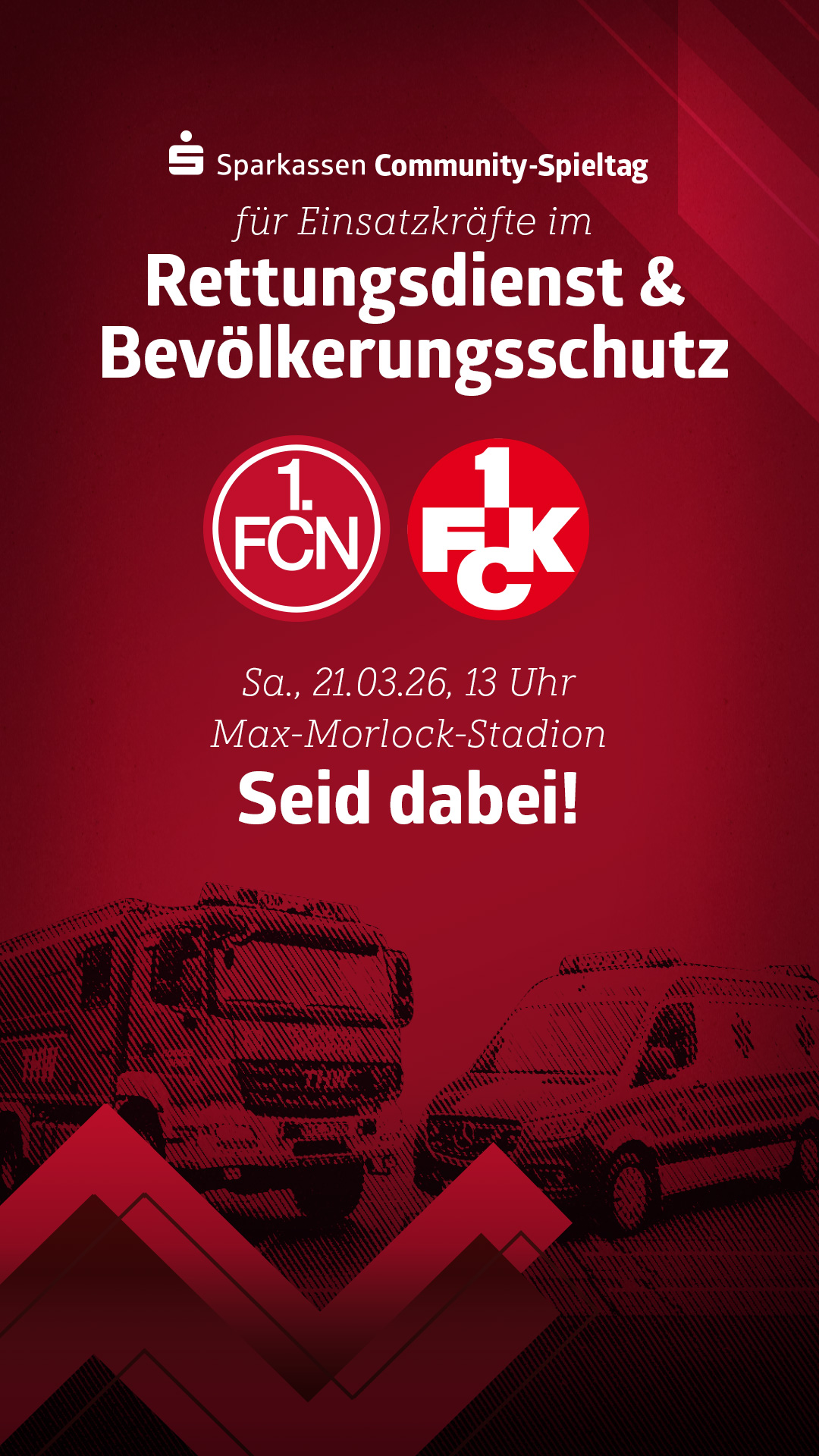 Für diesen haupt- und oftmals ehrenamtlichen Einsatz der Einsatzkräfte und die große Verantwortung, die sie für andere übernehmen, wollen sich die Sparkasse Nürnberg und der 1. FC Nürnberg bedanken. Der Sparkassen Community-Spieltag gegen den 1. FC Kaiserslautern (Sa., 21.03.26, Anstoß: 13 Uhr) ist deshalb den Einsatzkräften im Rettungsdienst und Bevölkerungsschutz gewidmet.